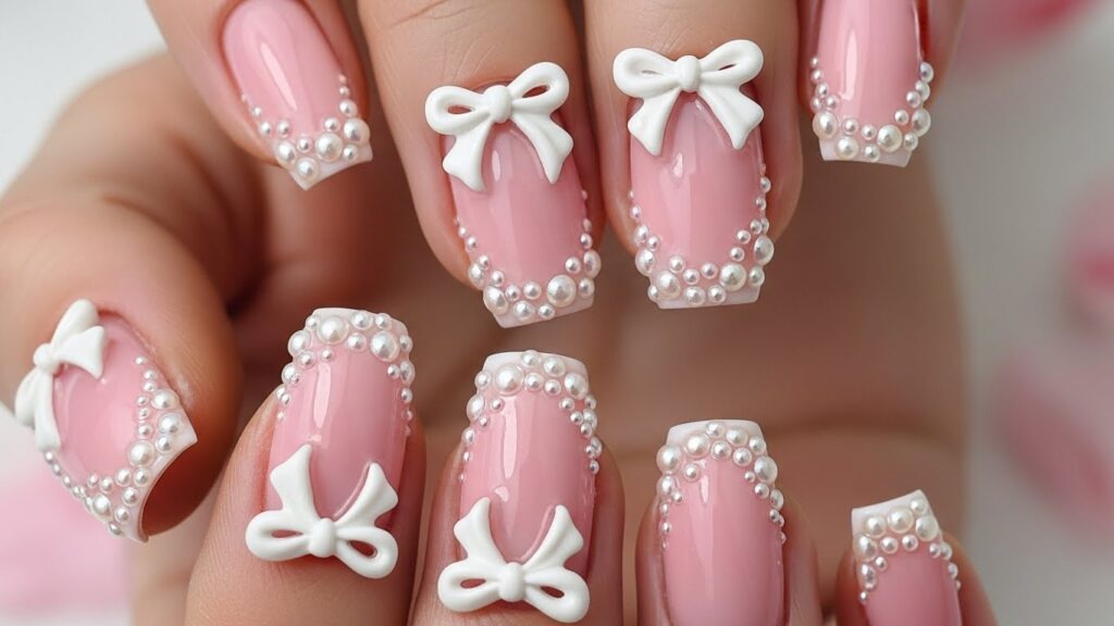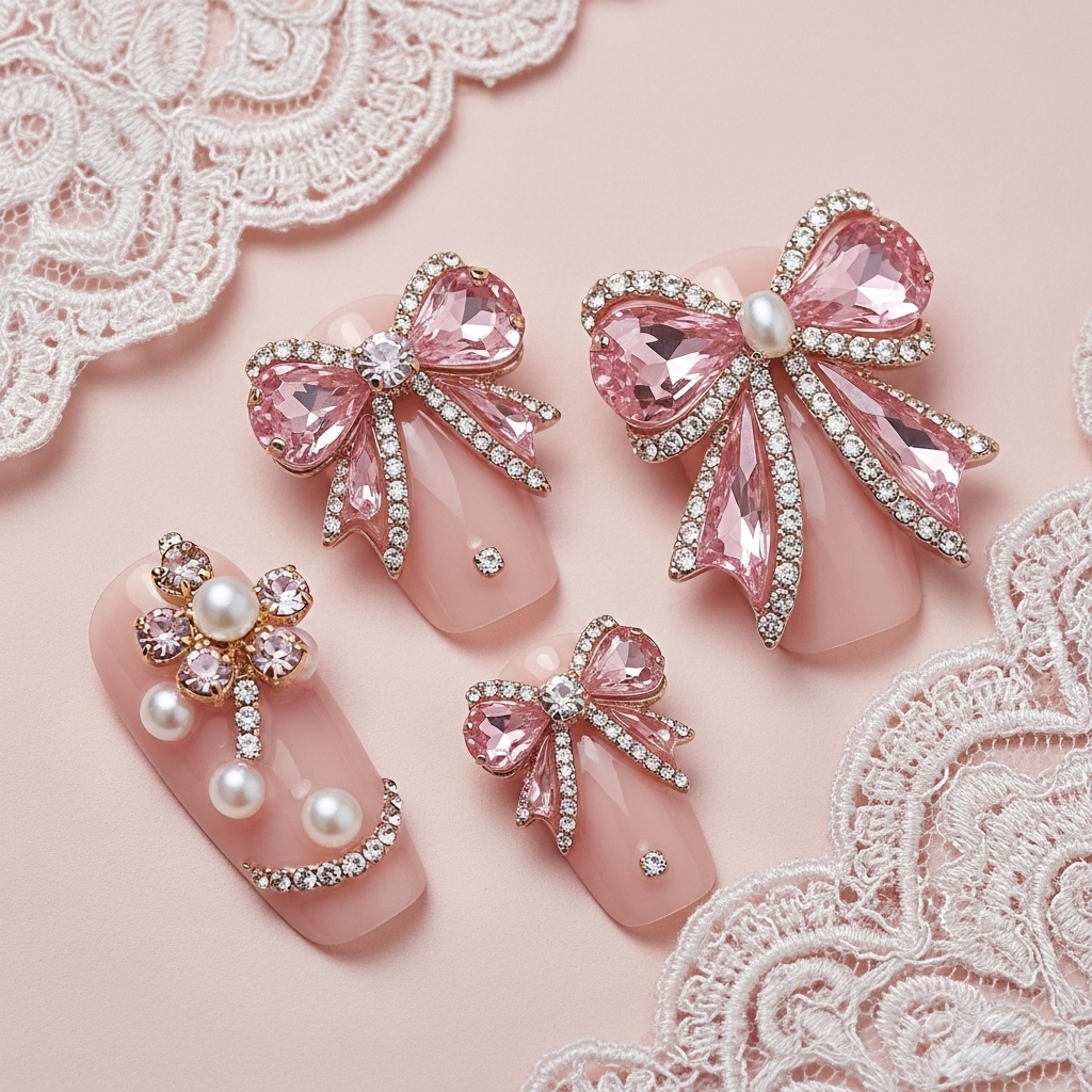 Romantic pink crystal bows rest on a flawless blush base, creating a delicate yet striking statement. Sculpted 3D bows shimmer beside crystal-lined edges and pearl-centered floral accents, adding depth and soft glamour.
