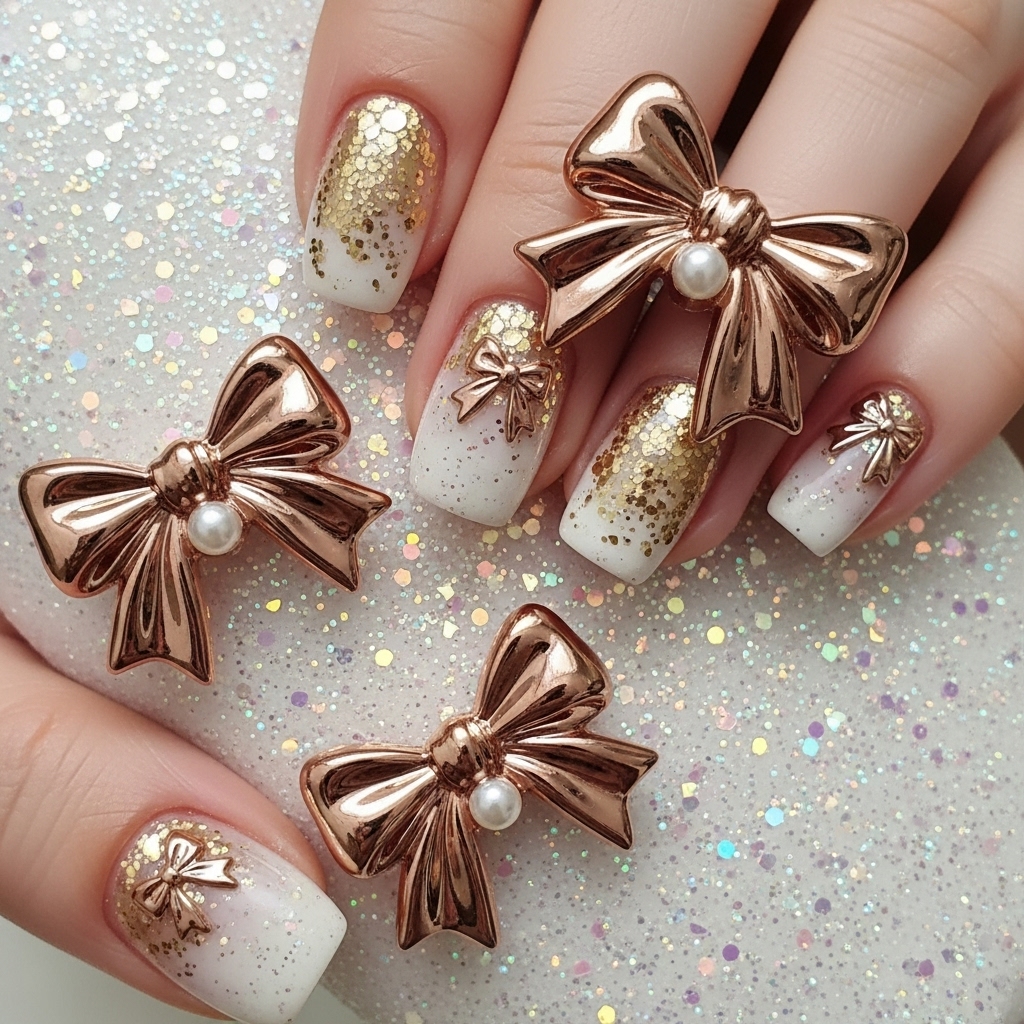 Sparkly rose gold bows steal the spotlight against an off-white DND Daisy Milk Bath base, softly dusted with iridescent glitter. Statement 3D metallic bows shimmer with polished drama, while delicate pearls rest at each knot, tempering shine with romance.