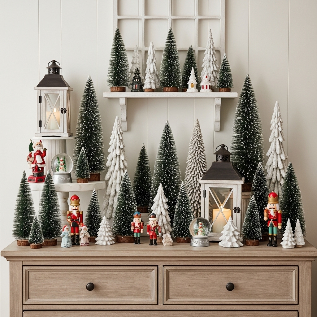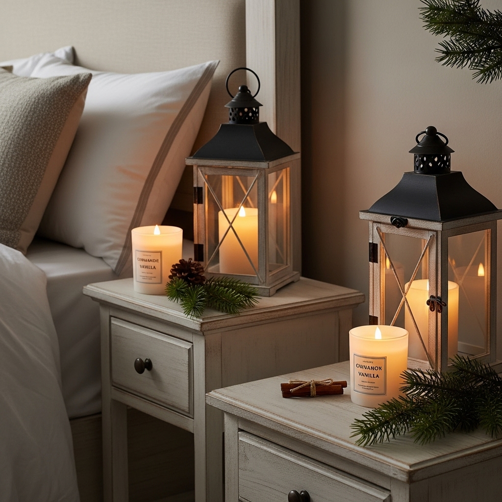 Mix in lanterns, snow globes, nutcrackers, or any small seasonal accents that add warmth without overwhelming the room. These tiny groupings create a layered, enchanting look, especially on nightstands, where every quick glance brings a fresh touch of festive magic.