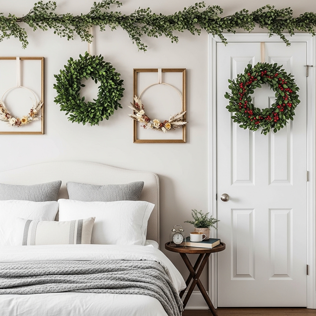 Fresh or faux garlands can transform your bedroom into a festive haven with almost no effort. Drape cedar, pine, or eucalyptus across the headboard, windows, or beams to add a natural aroma and a warm, cabin-style mood.