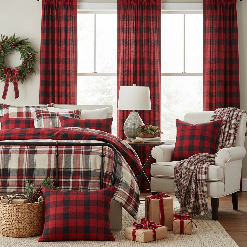 Plaid brings an instant wave of cozy Christmas charm whether it’s draped across pillows, layered as soft throws, or hung as festive curtains. Inspired by Country Living and BHG, red-and-black buffalo checks or muted tartans add warmth without overwhelming the room.