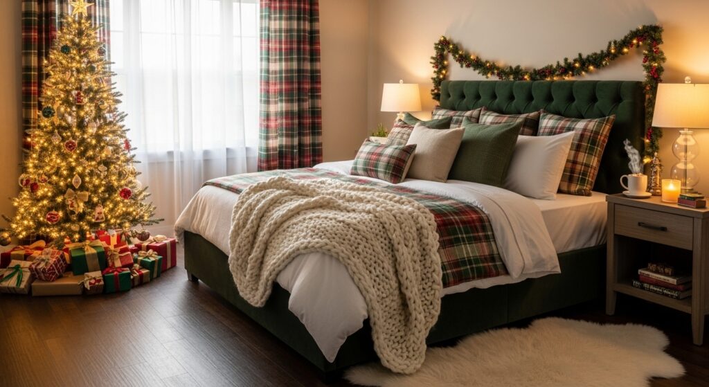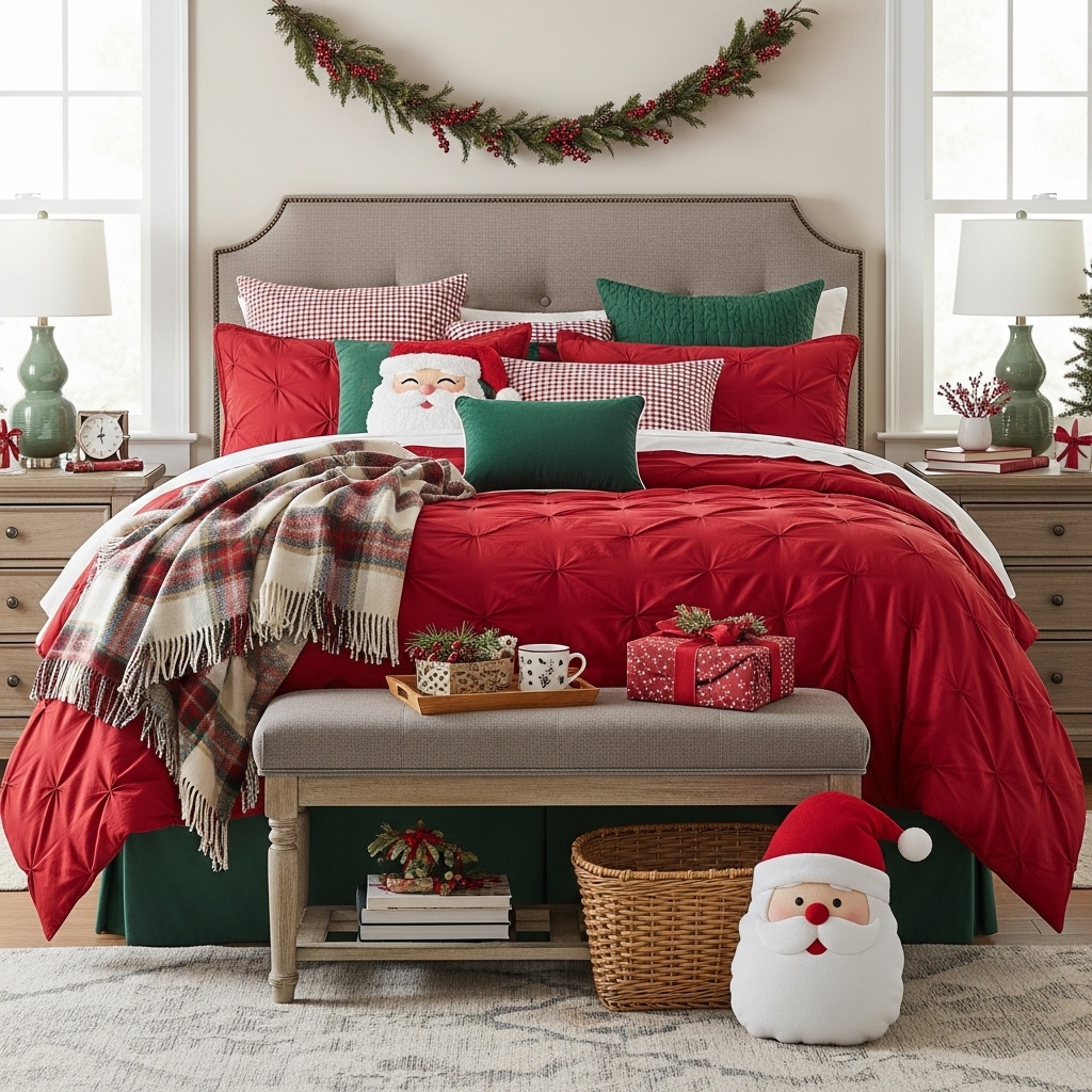 Pinterest overflows with inspiring setups plaid blankets layered over soft bedding, berry-trimmed garlands draped above the headboard, and playful Santa-themed pillows adding a cheerful twist.