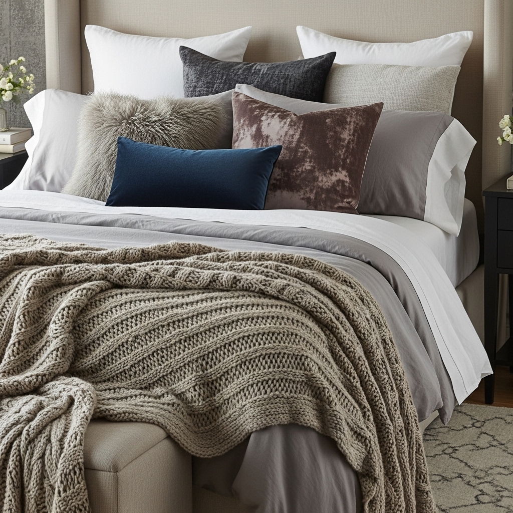 Start with crisp, high-thread-count sheets, then add a plush down comforter or a heavy duvet. The key is in the accents: layer a chunky knit throw blanket at the foot of the bed and pile on plenty of pillows.