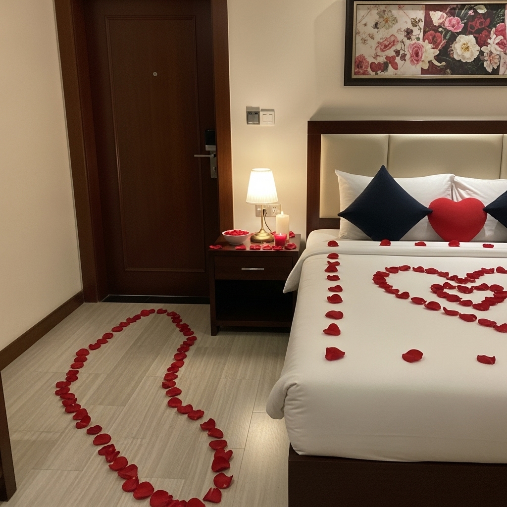 You might create a trail leading from the doorway to the bed, or shape a heart on the duvet. For a more modern and less messy twist, focus on the bedside tables: place a small bowl of fresh petals next to a candle or scatter them around the base of a lamp.