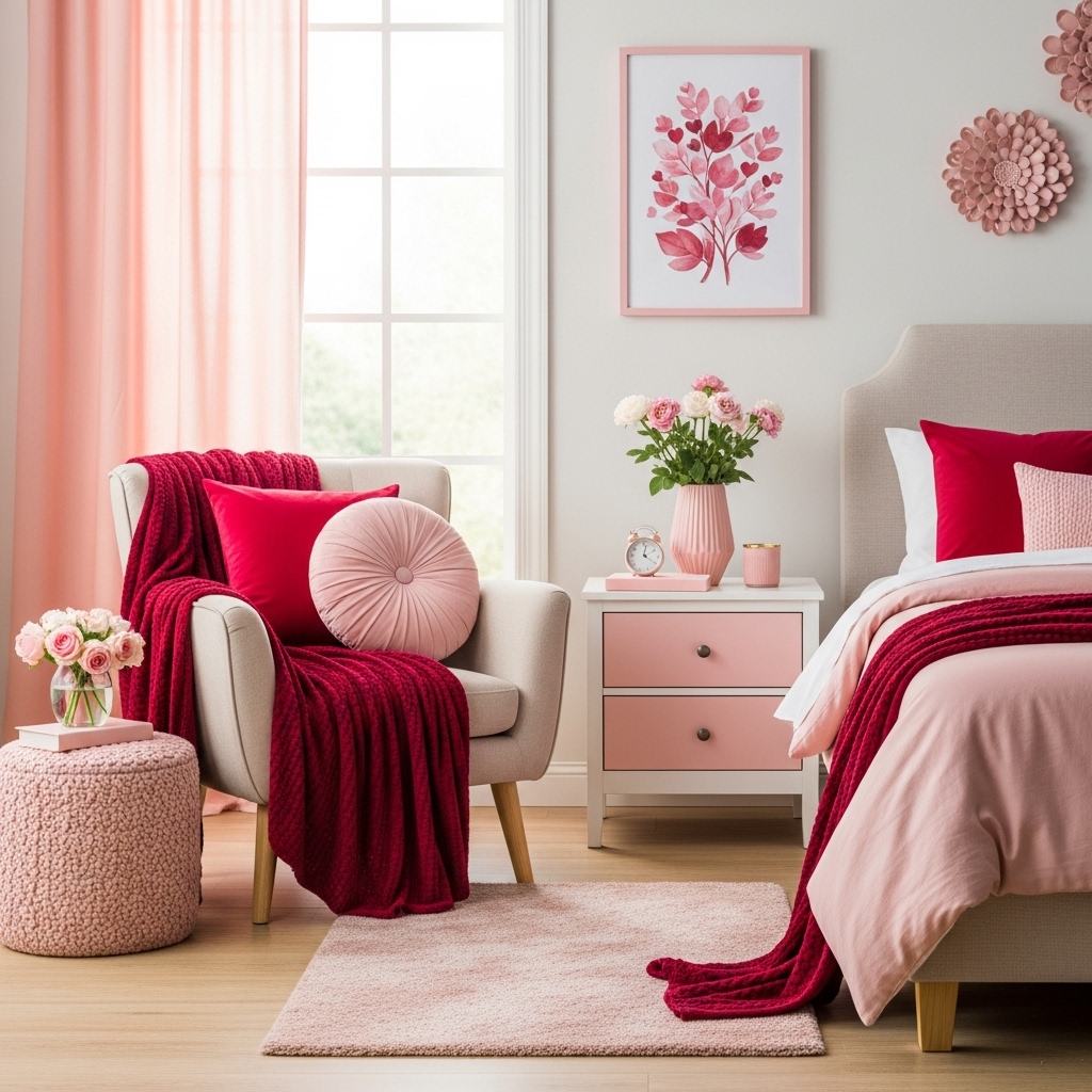You don’t have to paint your walls to bring in the colors of love. Introducing red, pink, and blush tones through accessories is an effective way to signal the theme.
