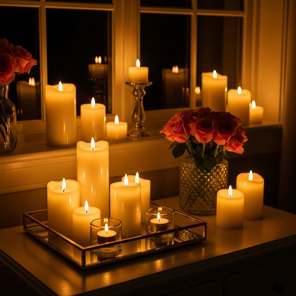 Candles are the quintessential romantic accessory. Their flickering light creates dancing shadows that soften imperfections and make skin look radiant. For a Valentine’s setup, variety is key.