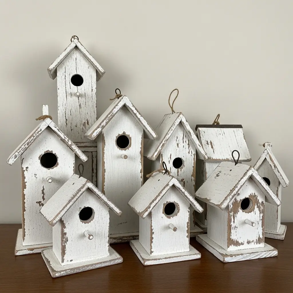 Gather a collection of small, varied wooden birdhouses from a craft store; the cheaper and plainer they are, the better. To give them a cohesive, weathered farmhouse look, paint them all a uniform white or cream.