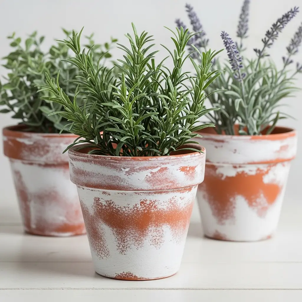 Standard orange terracotta can sometimes feel too harsh for a soft farmhouse palette. To give new pots an aged, chalky patina, mix white acrylic paint with a little baking powder or plaster of Paris to create texture.
