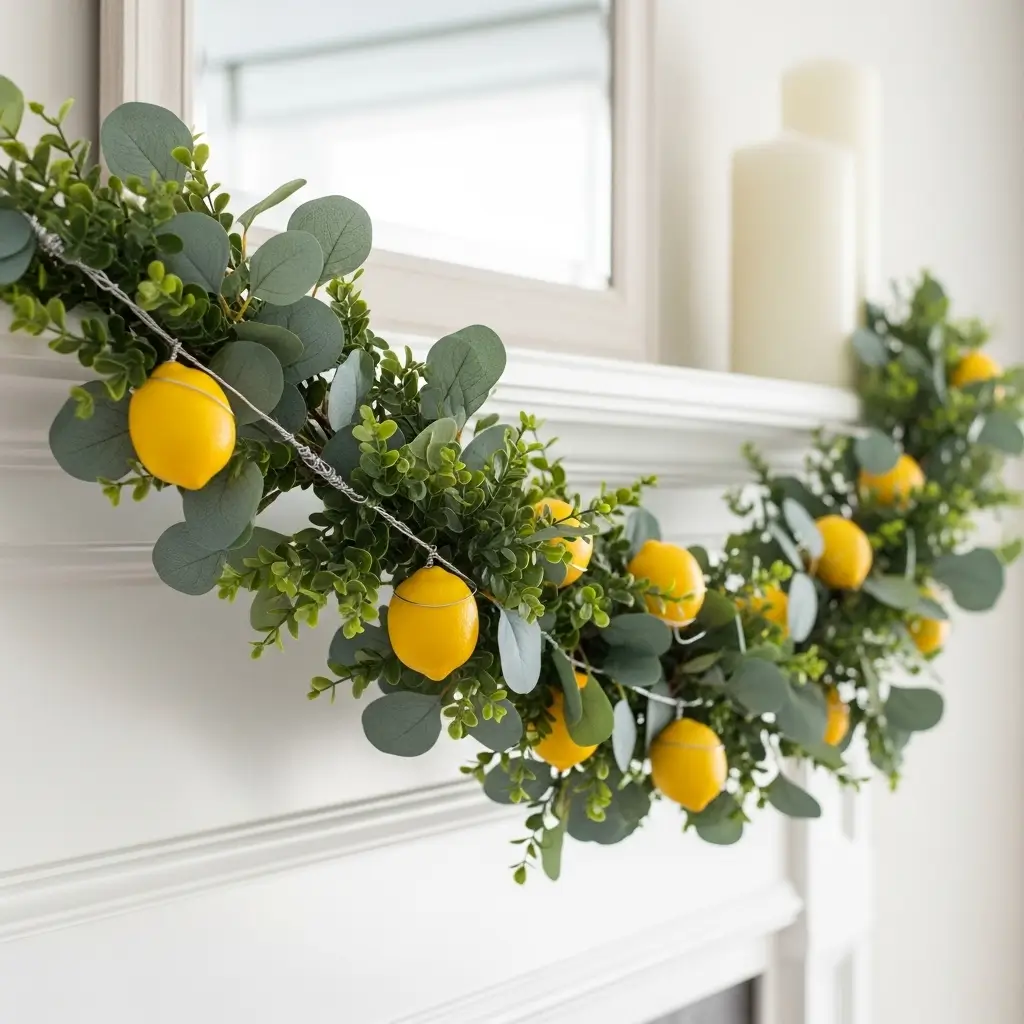 The real magic happens when you wire in artificial lemons every few inches. The bright pop of yellow against the muted greens creates a vibrant, fresh look. Drape it loosely across the mantle, allowing one side to hang slightly lower than the other for a casual, organic feel.