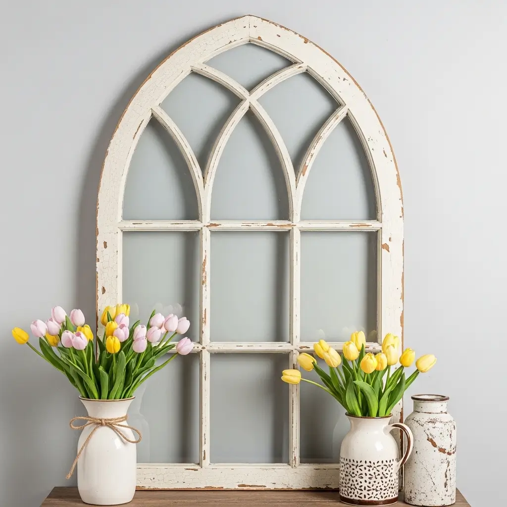Lean this frame against the wall behind your other decor. It acts as an architectural anchor, reflecting light and adding a sense of history to your spring display without overwhelming other elements.