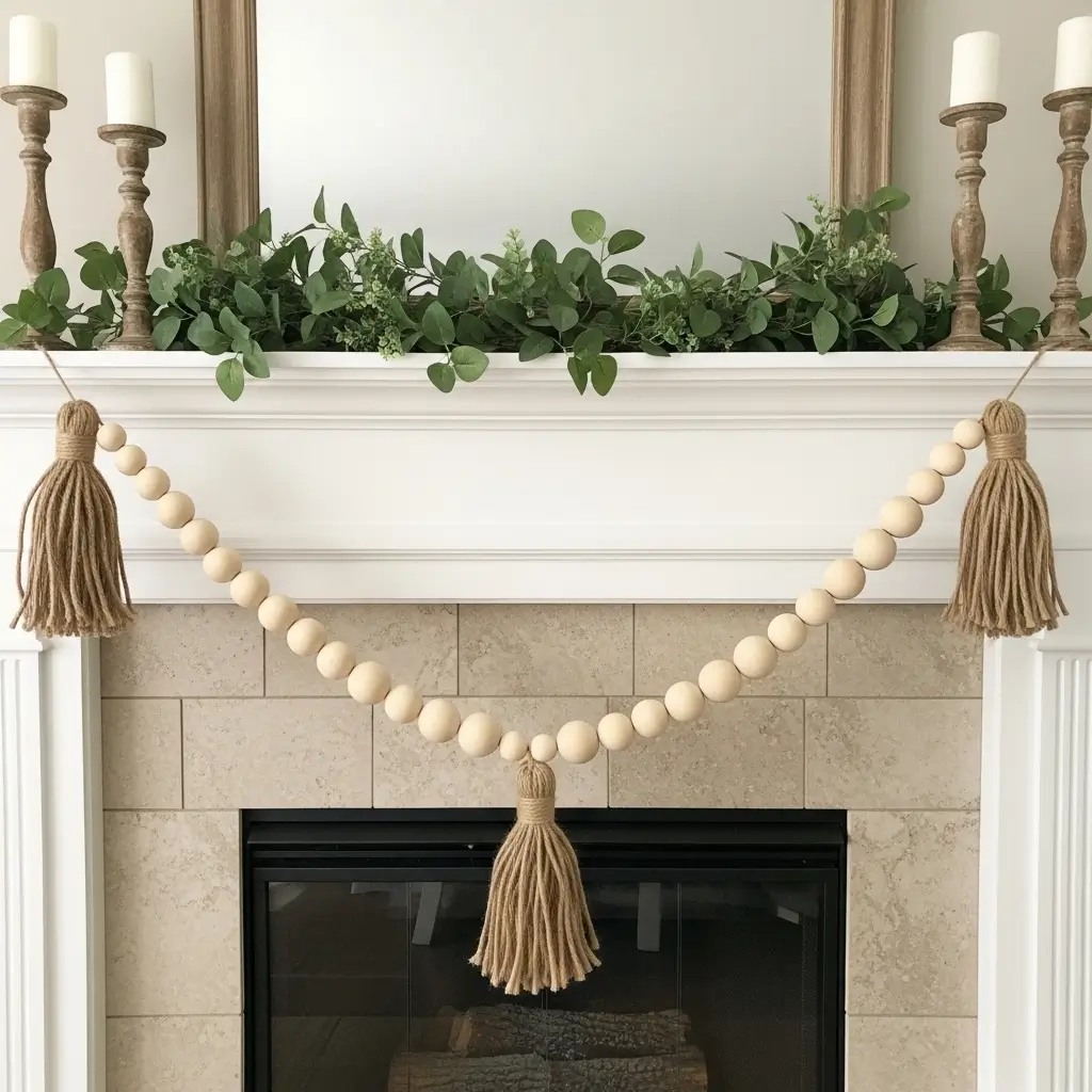 Create chunky tassels using jute twine or cotton yarn and attach one to each end of the garland. Drape it across the front of your display, allowing it to swag in the middle to soften the hard lines of the fireplace structure.
