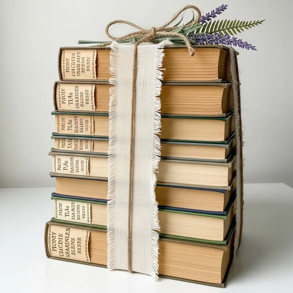 Stack them in groups of three or five varying sizes. Tie the bundles together securely with rough jute twine or a frayed strip of cream linen fabric. You can tuck a small sprig of faux lavender or a dried fern leaf under the twine for an extra botanical touch.