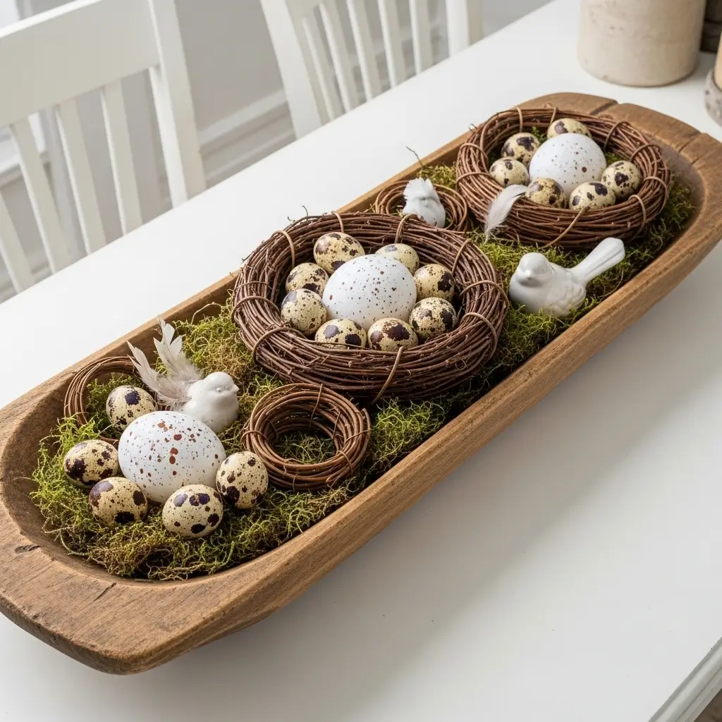 A long wooden dough bowl is a quintessential farmhouse vessel. Transform it into a massive spring nest for a striking centerpiece. Fill the bottom of the bowl with excelsior (wood wool) or Spanish moss to create a fluffy base.