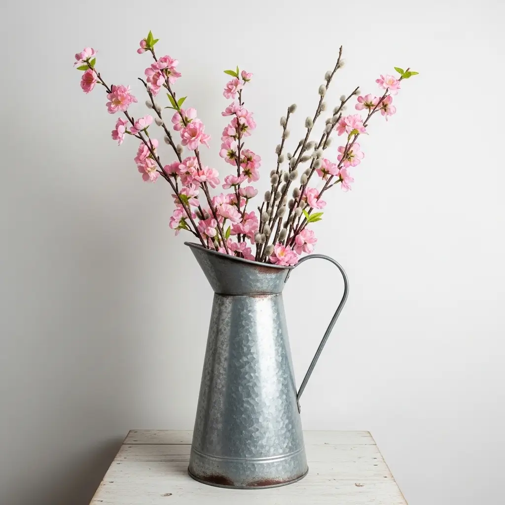 Fill the pitcher with tall, forcing branches like faux cherry blossoms, dogwood, or pussy willow stems. The height of the branches draws the eye upward, balancing the visual weight of the metal container perfectly.
