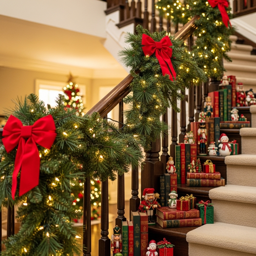 This look avoids overwhelming your space while adding festive warmth. You can fill the edges with decorative books or small holiday figurines for extra dimension without blocking stair use.