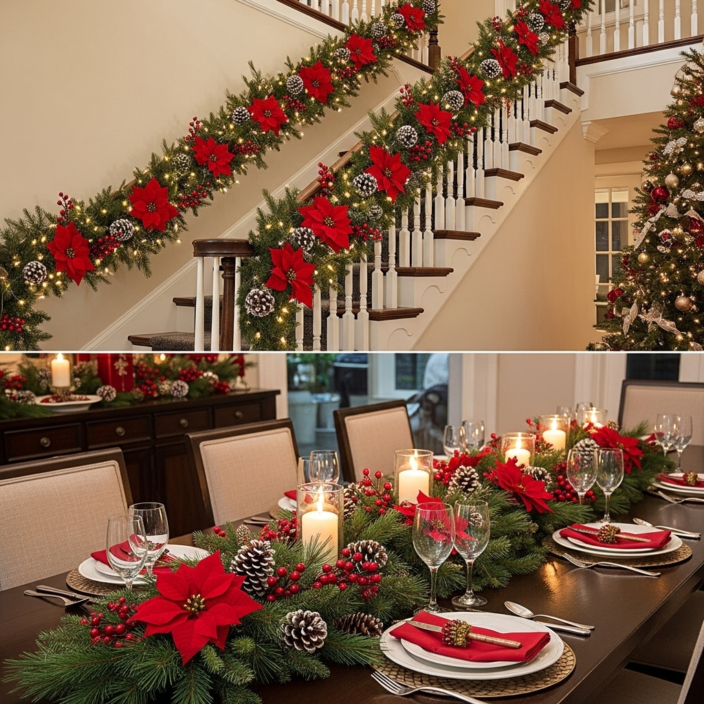 Match the staircase garland to your holiday table centerpiece using similar elements like poinsettias, pinecones, and berries. This continuity elevates your festive decor, making the staircase and dining area harmoniously connected.