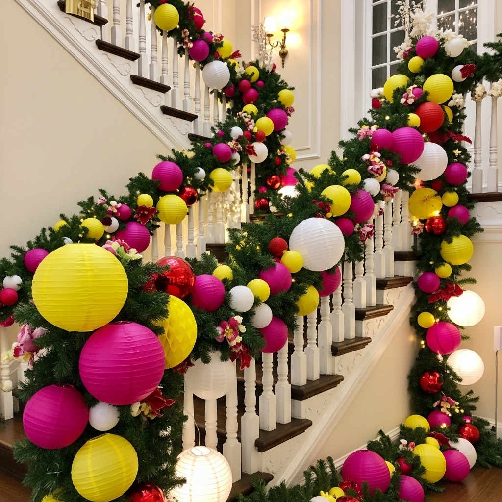 Go bold with an explosion of colorful paper lanterns, baubles, or ornaments in hues like fuchsia, lemon yellow, candy red, and crisp white draped along green garlands. This approach turns your staircase into a lively, joyful celebration hub.