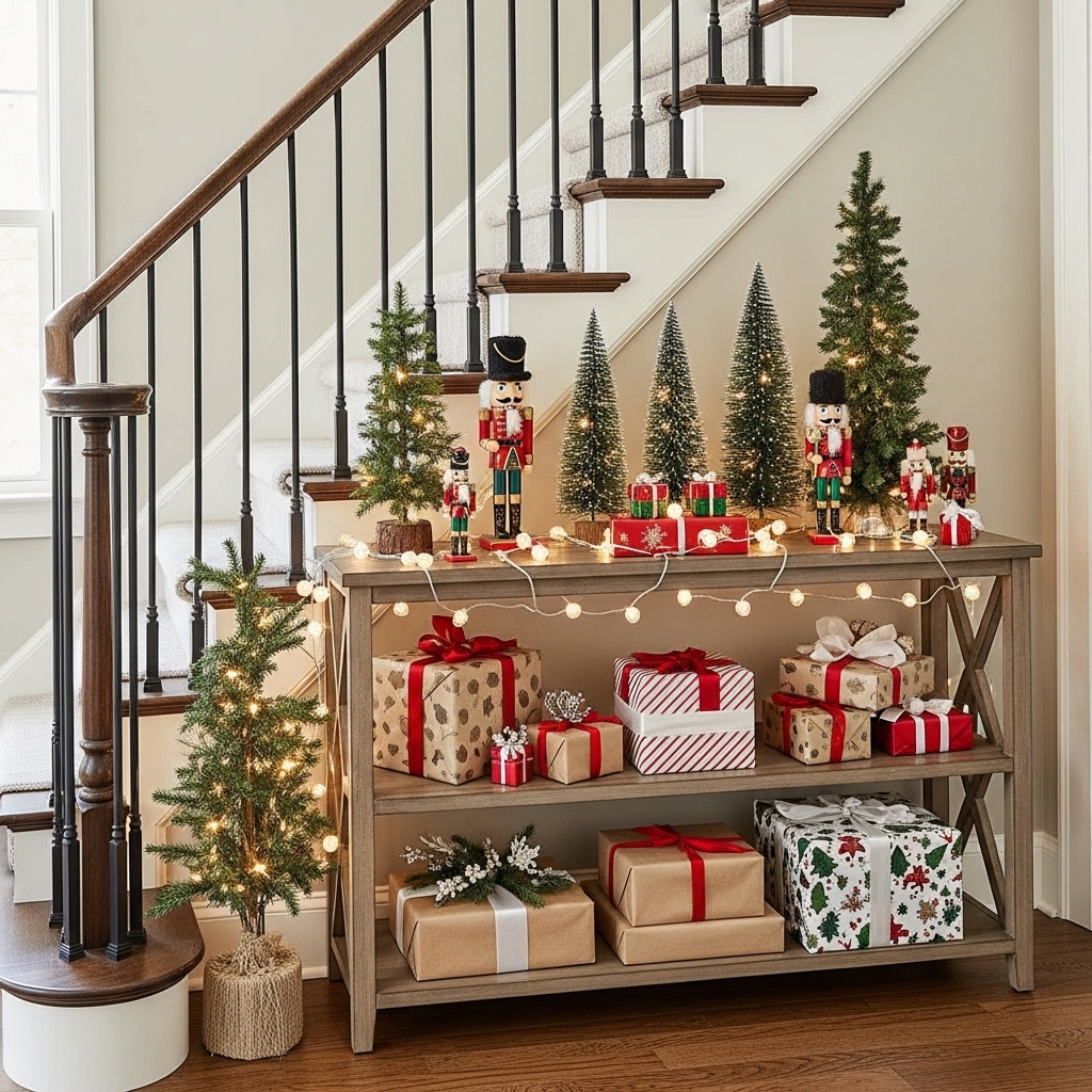 Set up a holiday-themed console or side table at the base of your staircase decorated with mini trees, nutcracker figurines, wrapped gifts, and string lights. This creates a welcoming festive nook where guests can pause and take in the holiday spirit.