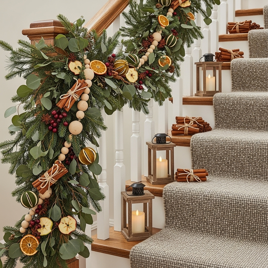 Incorporate natural wood accents, dried fruits, cinnamon sticks, and eucalyptus within your stairway decor. These elements bring an earthy warmth and aromatic delight that enrich the sensory holiday experience.