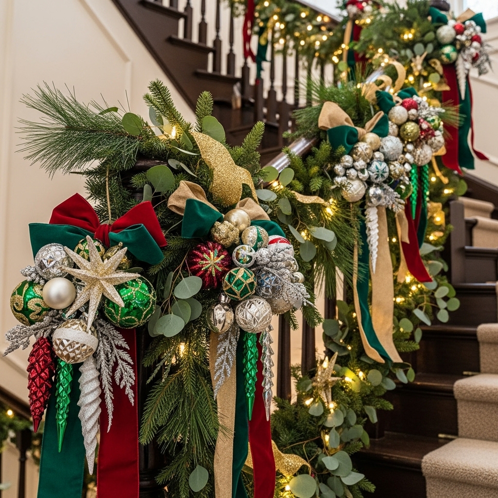 Bundle ornaments in clusters tied with luxurious ribbons along the banister intertwined with garlands or greenery. This adds texture, sparkle, and personalized detail with varied ornament shapes and finishes.