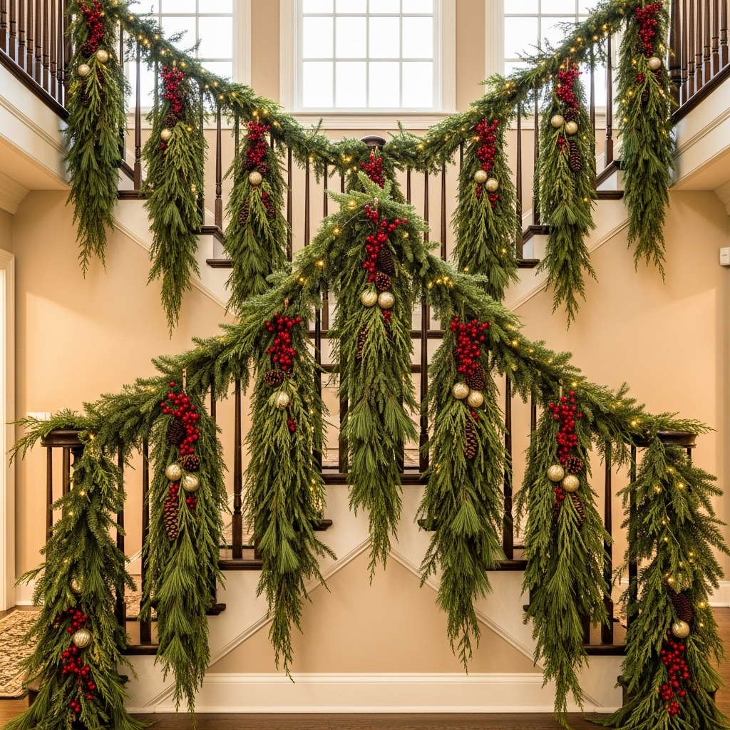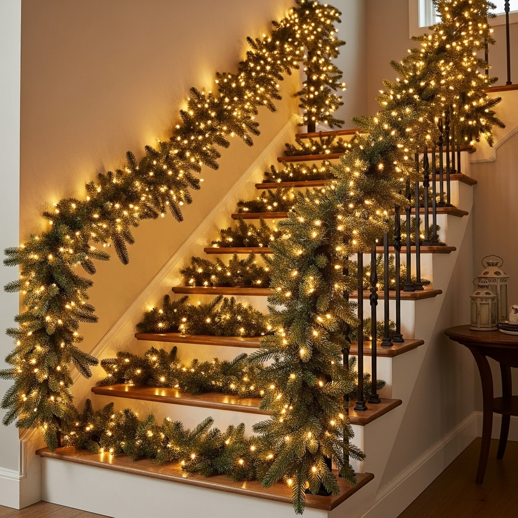 Drape your stairway with pre-lit evergreen garlands to bring a soft, inviting glow that transforms your home into a scene of warmth and charm.