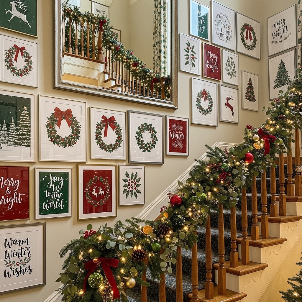 Transform the stairway walls into a Christmas gallery featuring seasonal prints, festive phrases, and wintry motifs. Choose a color palette dominated by reds and greens or opt for a neutral background with pops of bright holiday colors for modern flair. This idea spreads holiday cheer vertically and complements your overall decor.
