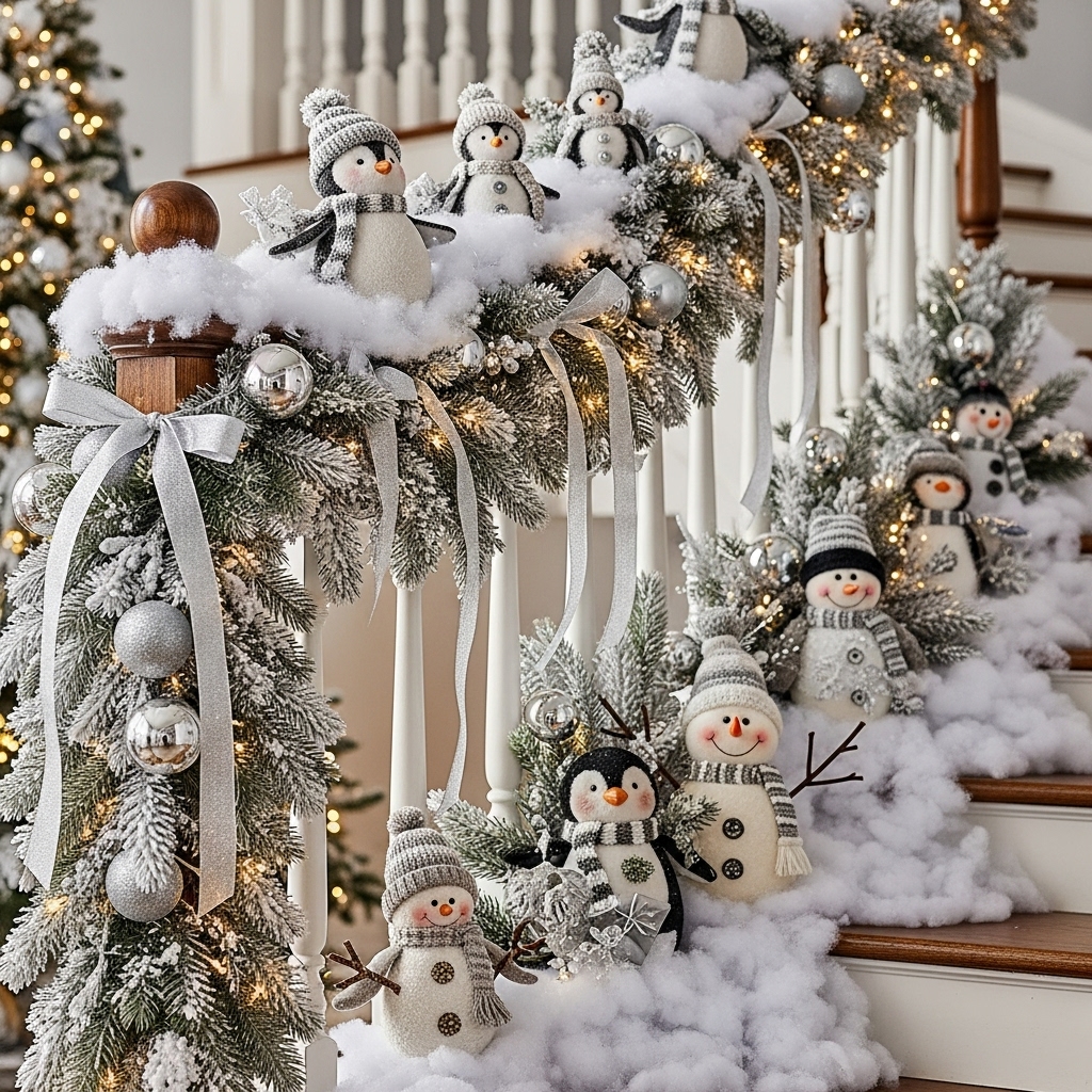 Create a whimsical winter display on the stair railing with faux snow blankets, accompanied by playful penguin or snowman figurines. Secure with ribbons or discreet ties for a magical, festive vignette.