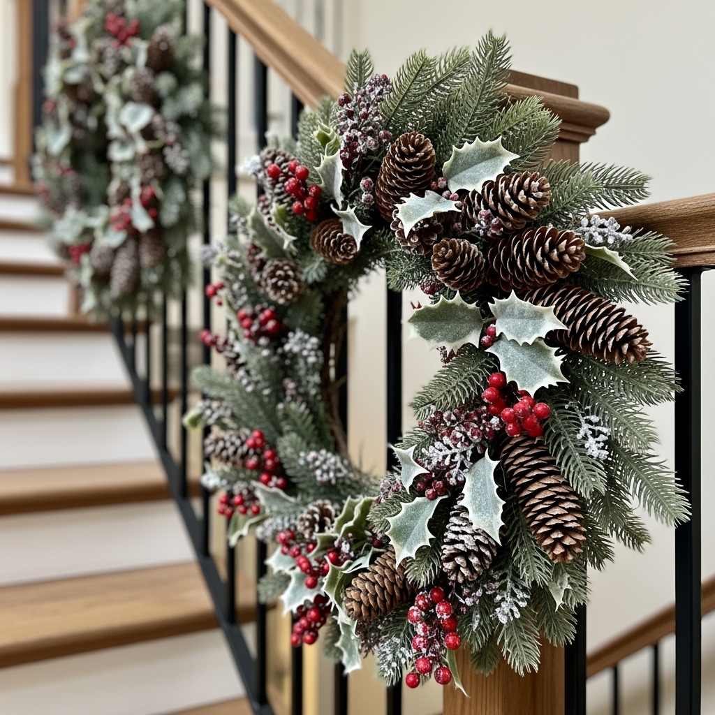 Drape your railings or staircase posts with enchanting winter wreaths woven from pinecones, holly berries, and lightly frosted greenery. Each detail breathes a sense of nature’s quiet elegance, blending rustic texture with festive grace.