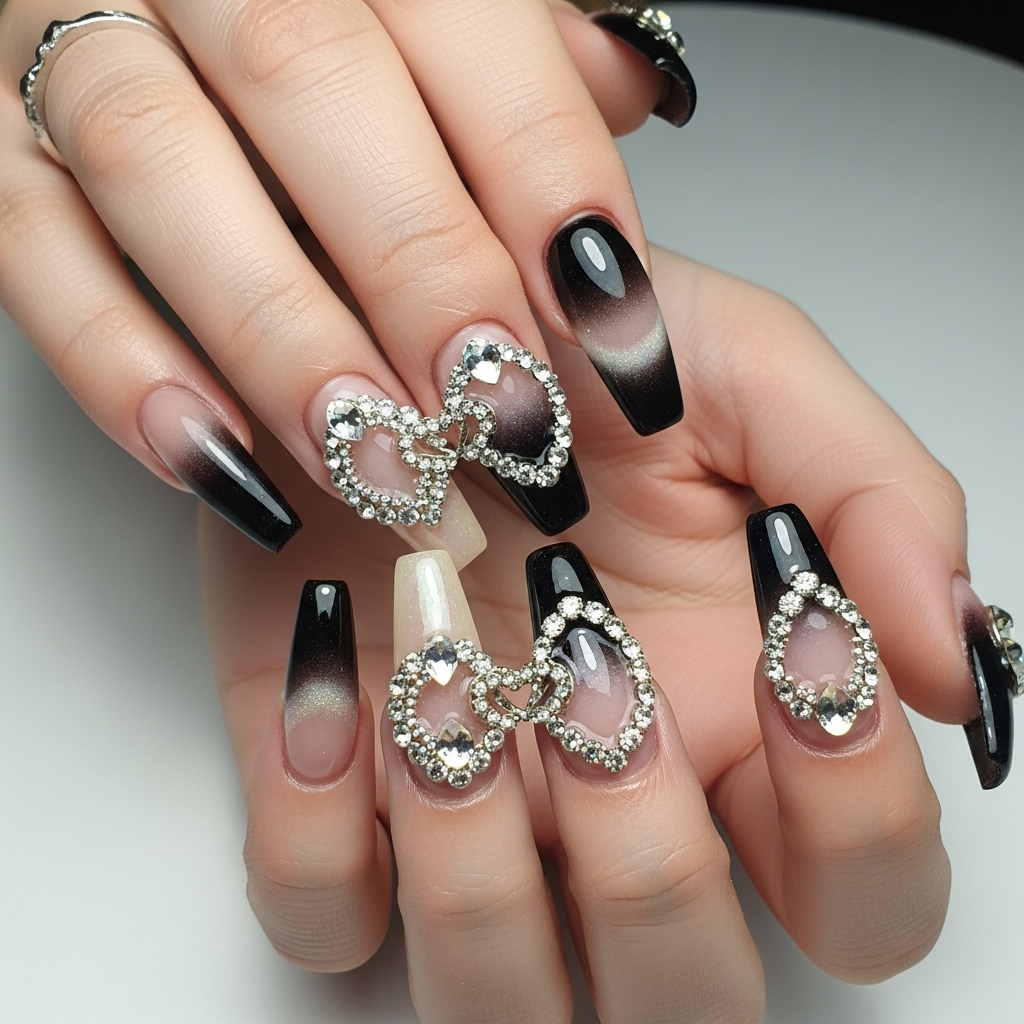 Three dimensional linked hearts cascade across dramatic coffin nails, creating depth you can almost feel. A layered cat-eye base shifts with light, while rhinestone hearts connect in a fluid chain, catching every movement.