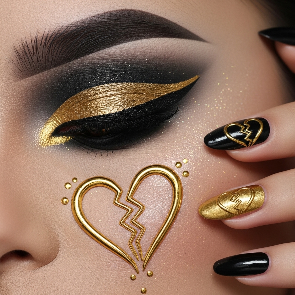 Ashen mist swirls across the lid. A classic cat-eye, reborn in charcoal shadows. Then, the alchemy happens. Molten gold traces the jagged silhouette of a heart, sharp and defiant. These Chrome Edge Hearts bridge the gap between street style and high-end elegance. It is an industrial romance.