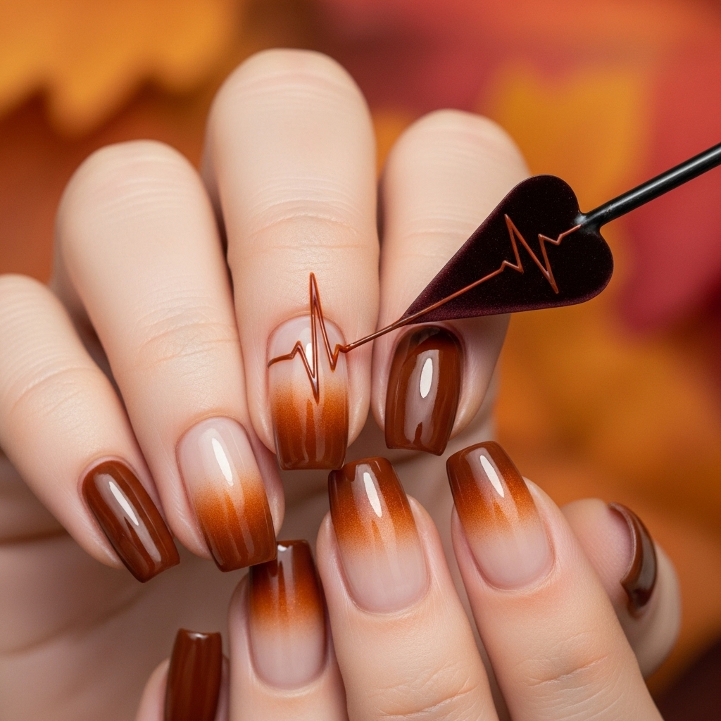 Molten caramel bleeds into autumnal dusk, a gradient of toasted sugar clinging to the nail. Suddenly, a pulse. Using the magnetic wand, we pull cinnamon pigment into a sharp, velvet heart. It’s a literal tug-of-war between seasons.