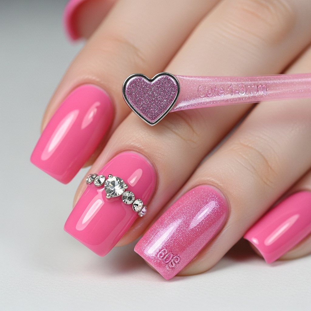 Cure for 60 seconds to lock in the effect. Finish by placing delicate rhinestones at the heart’s center, adding sparkle and romance. The result feels soft, feminine, and effortlessly charming. Perfect for dates, celebrations, or everyday elegance with a playful glow.