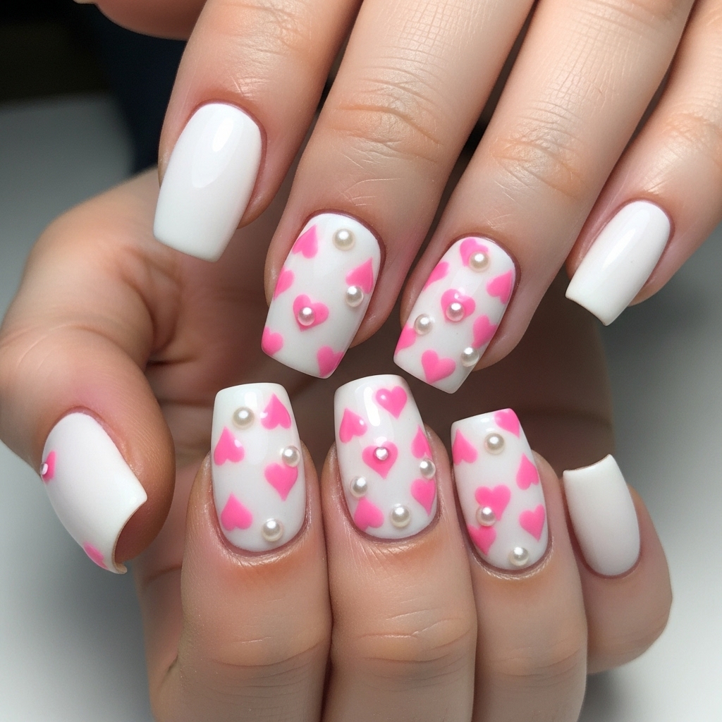 Each heart feels intentional yet effortless. Tiny pearls are placed at the centers, catching the light just right. The result is sweet, polished, and irresistibly viral perfect for that TikTok-approved, romantic aesthetic.