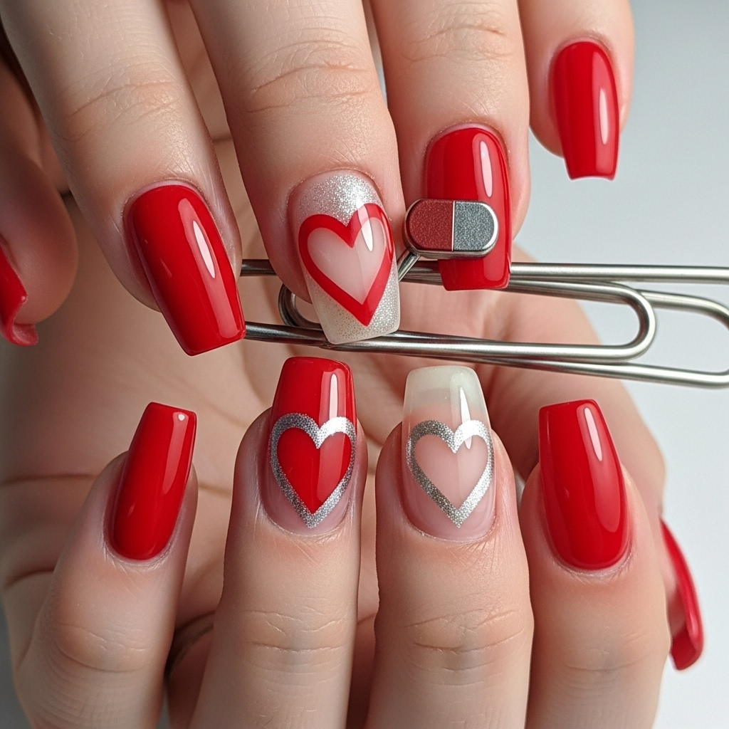 Inside that bold outline, layer a smaller silver heart for contrast and glow. Finish with a no-wipe gloss top coat, sealing everything in and creating rich, dimensional depth. Each layer adds drama, precision, and unmistakable romance.