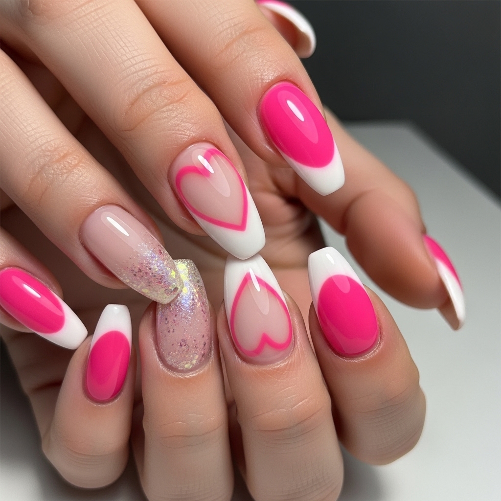 The Gradient Heart French Tip design strikes a perfect balance between softness and statement. A hot pink base gently melts into a milky white, created with a sponge-dabbed heart outline that feels playful yet refined.