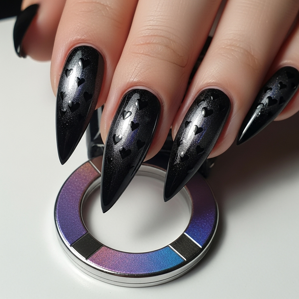 Midnight Black Hearts blends deep black with flashes of silver to create a sultry, high-impact cat-eye effect. Tiny heart accents can be stamped or carefully drawn, adding a playful contrast to the dark base.