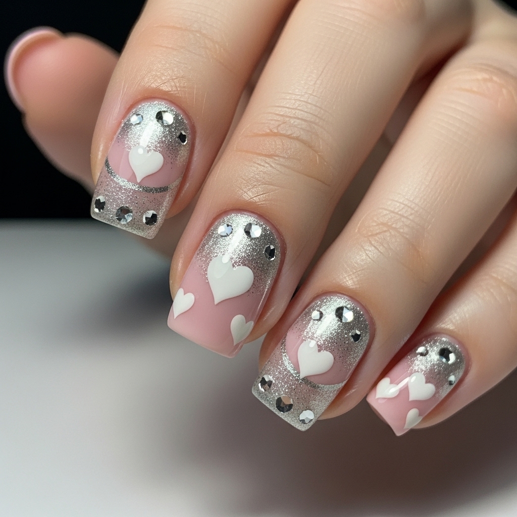 Sparkling Silver Hearts brings a delicate balance of romance and shine. A soft pink base sets a gentle tone, topped with a silver cat-eye layer that catches light from every angle. White hearts are stamped with intention, clean and playful rather than overpowering.
