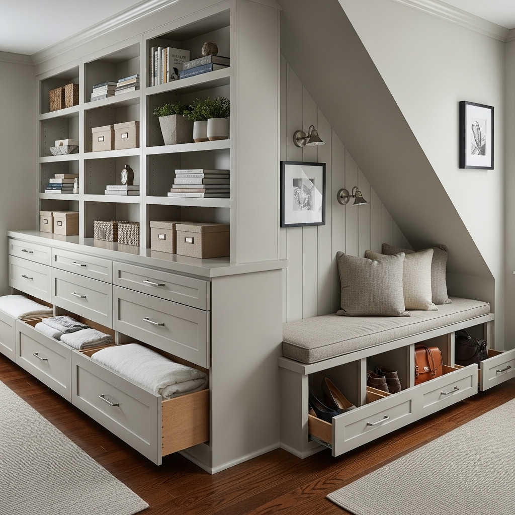 - Built-in storage that hugs the wall can save space and keep clutter at bay.