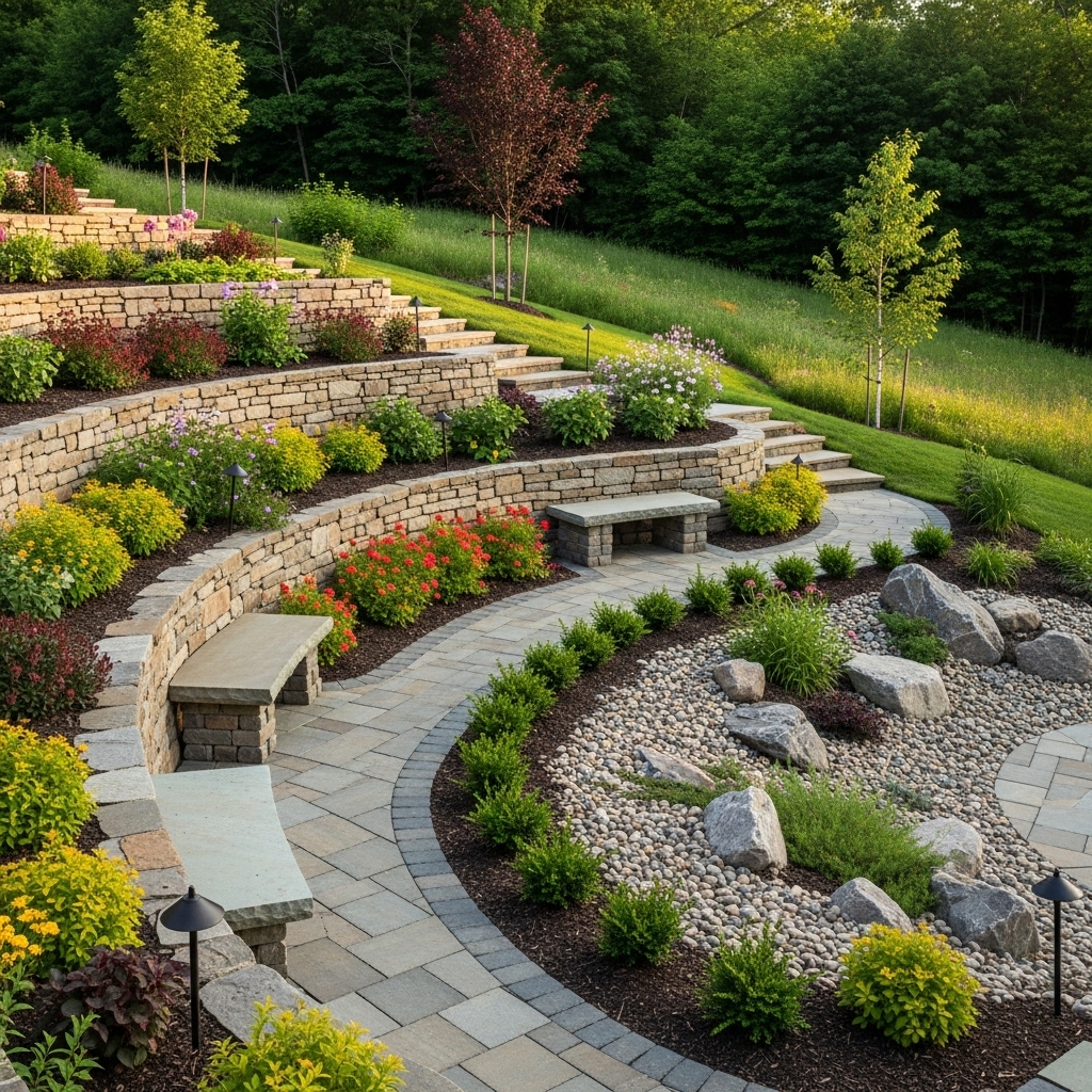 Besides terraces and paths, adding hard features like retaining walls, benches, or rock gardens can make your slope both pretty and practical.
