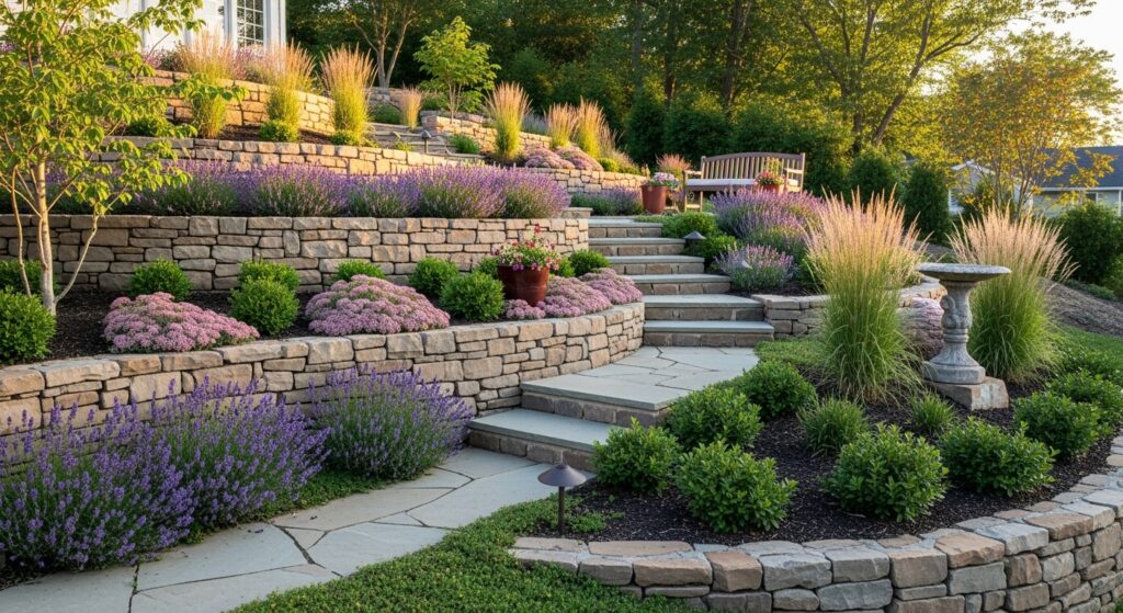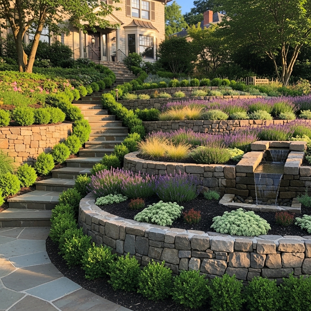 When people think slope landscaping, terraces usually come up first. They’re basically flat steps cut into the hill, held back by walls, creating mini-levels for planting or lounging. Terracing does wonders for controlling erosion and making your yard accessible.