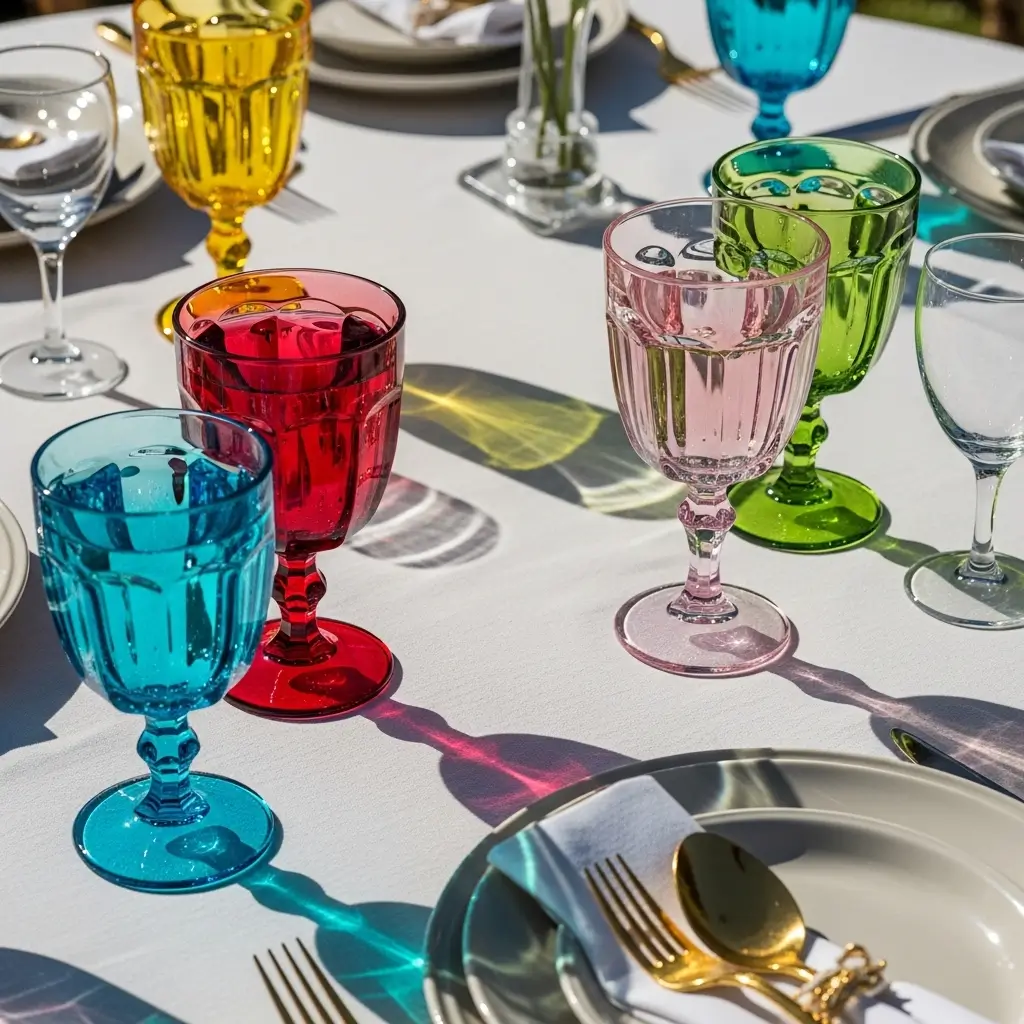 Rich jewel tones or soft, muted pastel goblets instantly add an incredibly playful, joyful pop of vibrant color to an otherwise neutral table setting.