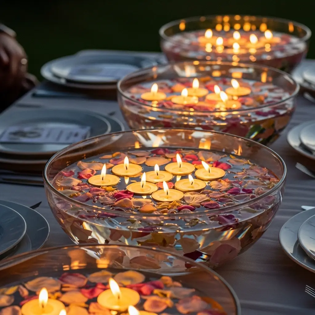 Fill several large, shallow glass basins with fresh water, scattering delicate flower petals and small, unscented tea lights across the calm surface.