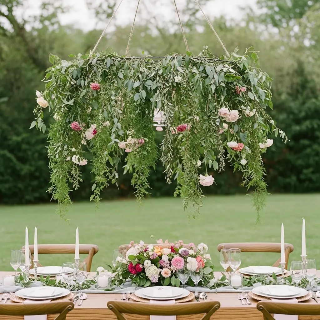 Take your outdoor decor to absolute new heights by crafting a magnificent, breathtaking floral chandelier to hang directly over the table.