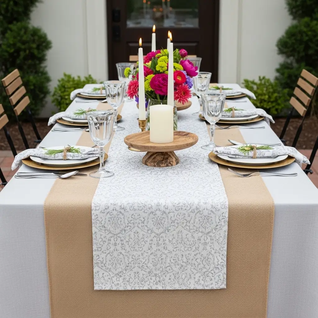 Start with a wide, neutral burlap or linen base, then place a slightly narrower, delicately patterned fabric directly on top.