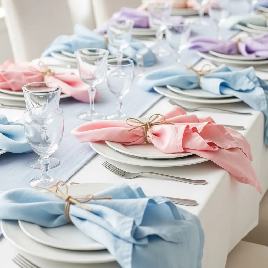 Elevate the overall aesthetic of your celebration by utilizing luxurious, soft pastel linen napkins elegantly draped or folded at every seat.