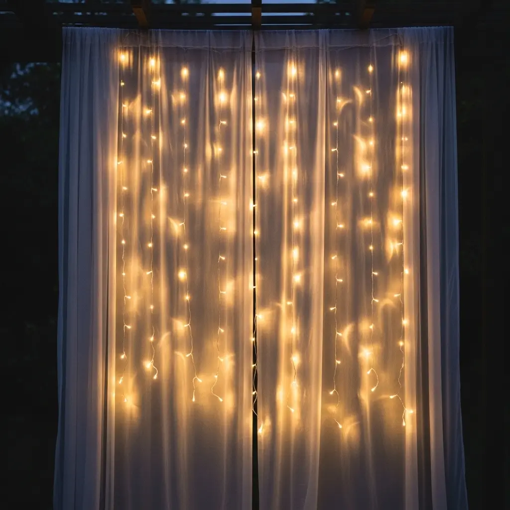 Hang a sheer white fabric panel from a pergola or sturdy branch, then layer several strings of warm-white LED twinkle lights directly behind it.