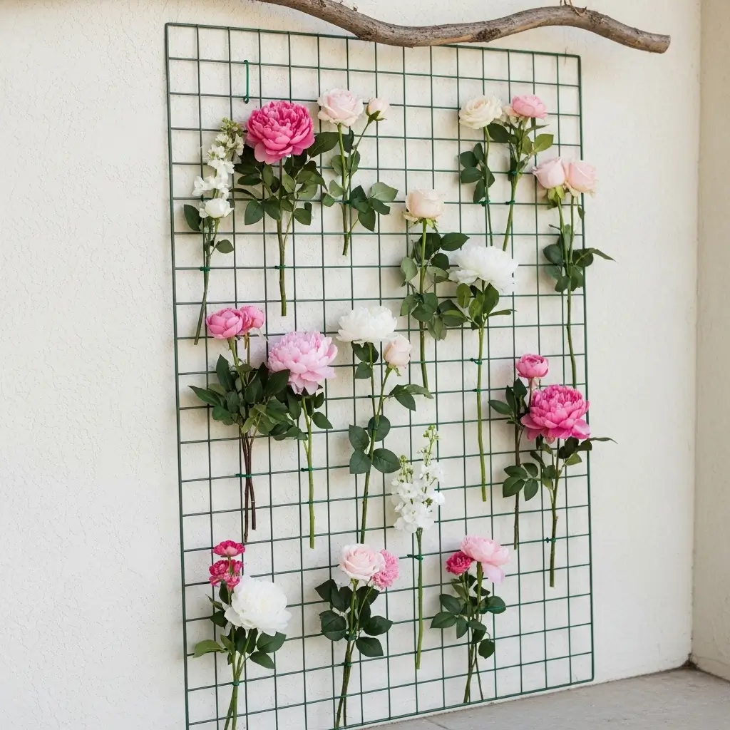 Create a stunning visual by attaching fresh or faux flowers to a wire grid panel. This elegant setup offers a sophisticated, garden-party aesthetic perfect for celebrating Mom.