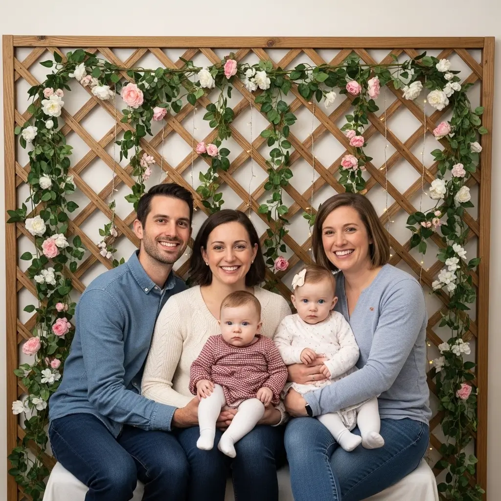 Utilize an existing garden trellis or purchase an inexpensive wooden lattice panel to create an elegant, structured photo backdrop.