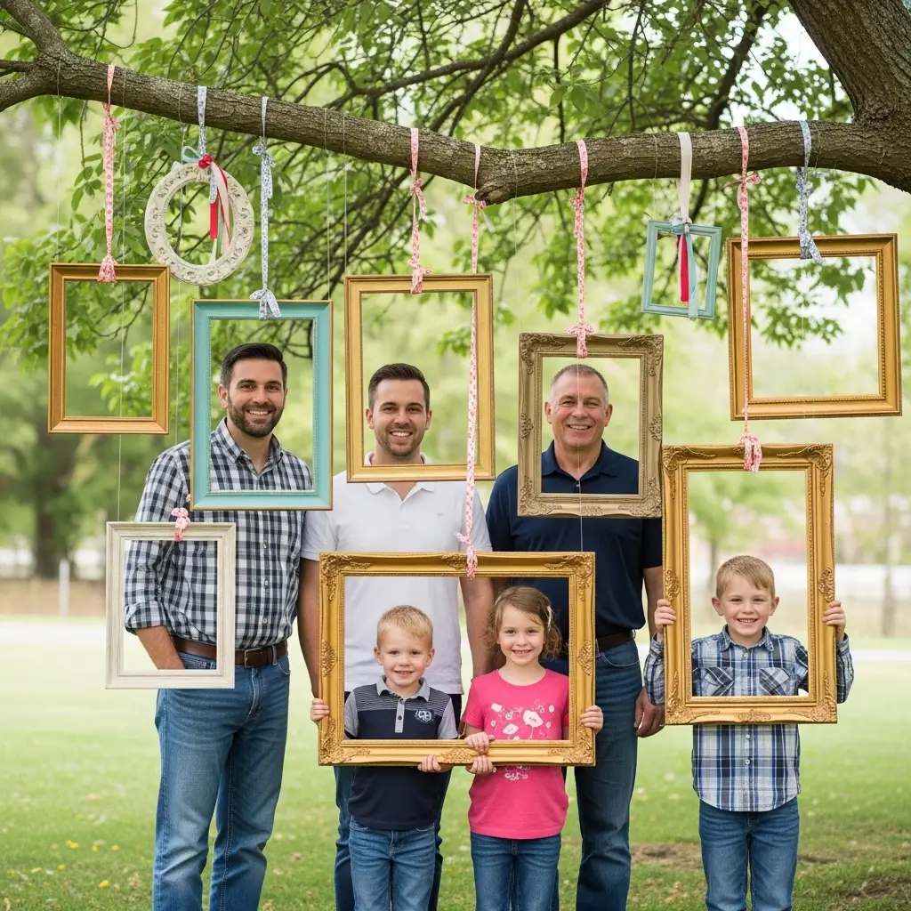 Create a fascinating, multi-dimensional photo booth by hanging an assortment of empty picture frames from a sturdy tree branch.