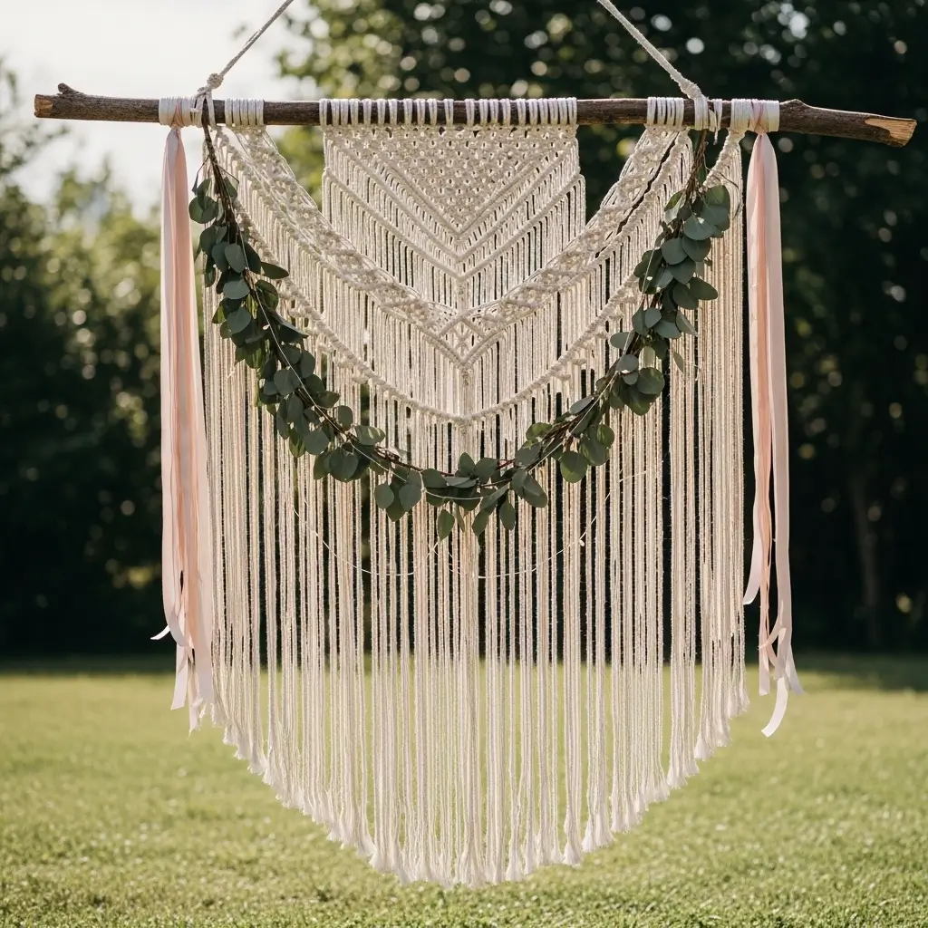 You can elevate the look by intertwining delicate eucalyptus leaves, fairy lights, or soft pastel ribbons through the woven cotton cords.